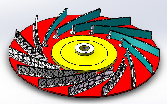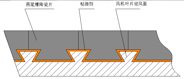 风机叶轮 在叶片头部、叶片表面及后盘易磨损部位镶嵌高韧性耐高温耐磨陶瓷(氧化锆增韧氧化铝陶瓷)。陶瓷与叶片以燕尾槽结构镶嵌。这种镶嵌的陶瓷工艺,由于单片陶瓷的面积较小,即使风机内进入异物造成单片陶瓷碎裂也不影响风机动平衡,耐磨陶瓷可以更换。