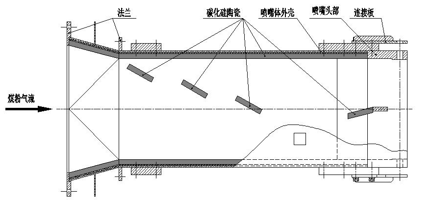 燃煤锅炉燃烧器易出现磨损、烧损、变形、开裂等问题,影响锅炉效率和超低排放指标。利用碳化硅陶瓷的耐磨、耐高温、抗热震特性,将碳化硅陶瓷整体内衬于燃烧器的易损部位上,可有效解决上述问题,进而提高燃烧器的可靠性和使用寿命。针对燃烧器不同部位的工作环境,采用不同性能的碳化硅陶瓷。