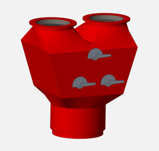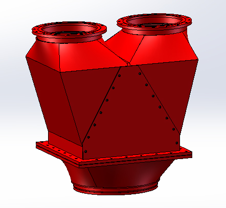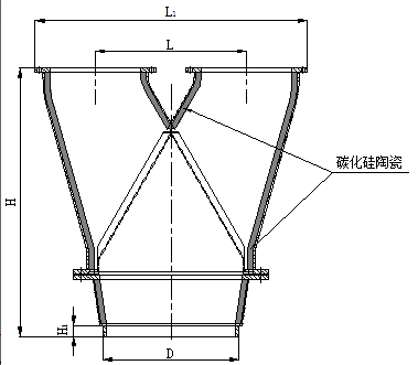 固定式煤粉分配器采用碳化硅陶瓷作防磨内衬,碳化硅陶瓷整体烧结成筒节衬套于分配器内部。通过安装在入口处的分配体对煤粉进行分配,分配体把入口截面等间距分隔,并通过左右交替的通道把风和煤粉平均分配到两个出口。分配体通道冲击磨损严重的部分,镶装U型燕尾氧化铝陶瓷,保证分配体不被磨漏而失去分配功能。